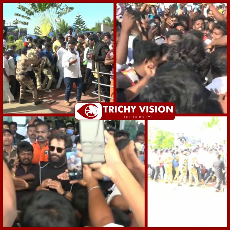 இதற்காக சென்னையில் இருந்து விமானம் மூலம் இன்று காலை திருச்சி வந்த நடிகர் விக்ரம் விமான நிலையத்தில் இருந்து வெளியே வந்தபோது அவரை காண ஏராளமான ரசிகர்கள் சூழ்ந்தனர், பயணிகள் உள்ளே செல்லும் பாதைக்கு ரசிகர்கள் ஓடி வந்தனர்.அவருக்கு மாலை மட்டும் சால்வை அணிவிக்க முற்பட்டனர். விமானநிலைய வருகை இடத்திலேயே நூற்றுக்கணக்கான ரசிகர்கள் குவிந்ததால் அவர்களை மத்திய தொழில் பாதுகாப்பு படை வீரர்கள் தடியடி, மிதித்து விரட்டி அடித்தனர்.