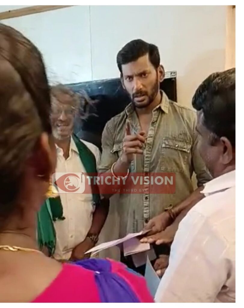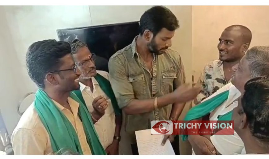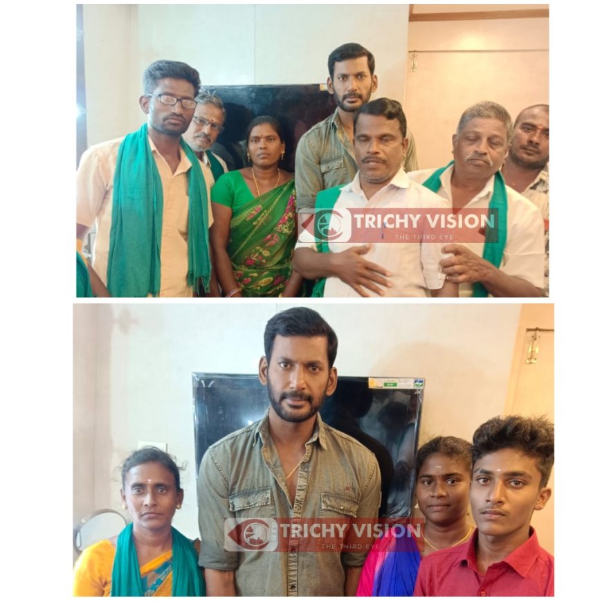 திருச்சி அருகே சிறுமருதூர் சாலையில் நடைபெற்று கொண்டிருந்த படப்பிடிப்பு தளத்தில் நடிகர் விஷாலை தேசிய தென்னிந்திய நதிகள் இணைப்பு விவசாயிகள் சங்கத்தை சேர்ந்தவர்கள் சந்தித்து கோரிக்கை மனு அளித்தனர். அப்போது டெல்லியில் போராட்டம் நடத்திய திருச்சி மாவட்டம் முசிறி வட்டம் ராயப்பட்டி கிராமத்தை சேர்ந்த விவசாயி ஜெகதீசன் (கடந்த 11.11.2023 சனிக்கிழமை) தன்னுடைய வயலில் பாசனம் செய்ய கிணற்றில் இருந்து மின்மோட்டாரில் நீர் இறைக்கும்போது மின்சாரம் தாக்கி உயிர் இழந்தார்.