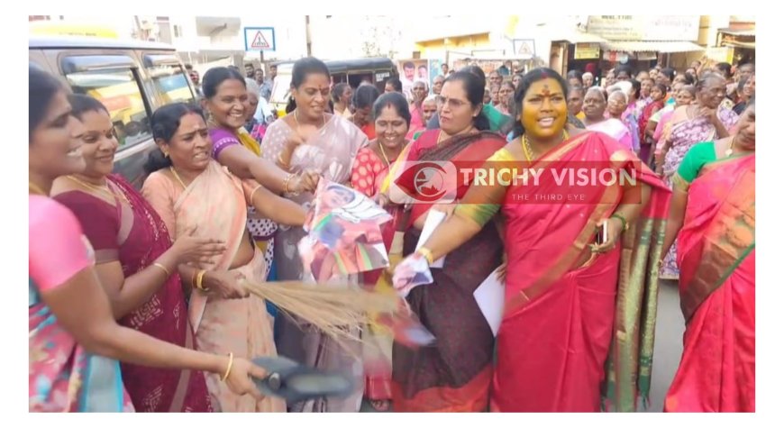 இதனைத் தொடர்ந்து திருச்சி மத்திய பேருந்து நிலையம் பகுதியில் உள்ள பெரியார் சிலை முன்பு திருச்சி மத்திய மாவட்ட மகளிர் அணி சார்பில் 50க்கும் மேற்பட்ட பெண்கள் நடிகை குஷ்பூவுக்கு எதிராக கோஷங்கள் எழுப்பி அவரது உருவப்படத்தை கிழித்து தங்களது எதிர்ப்பை தெரிவித்தனர்.