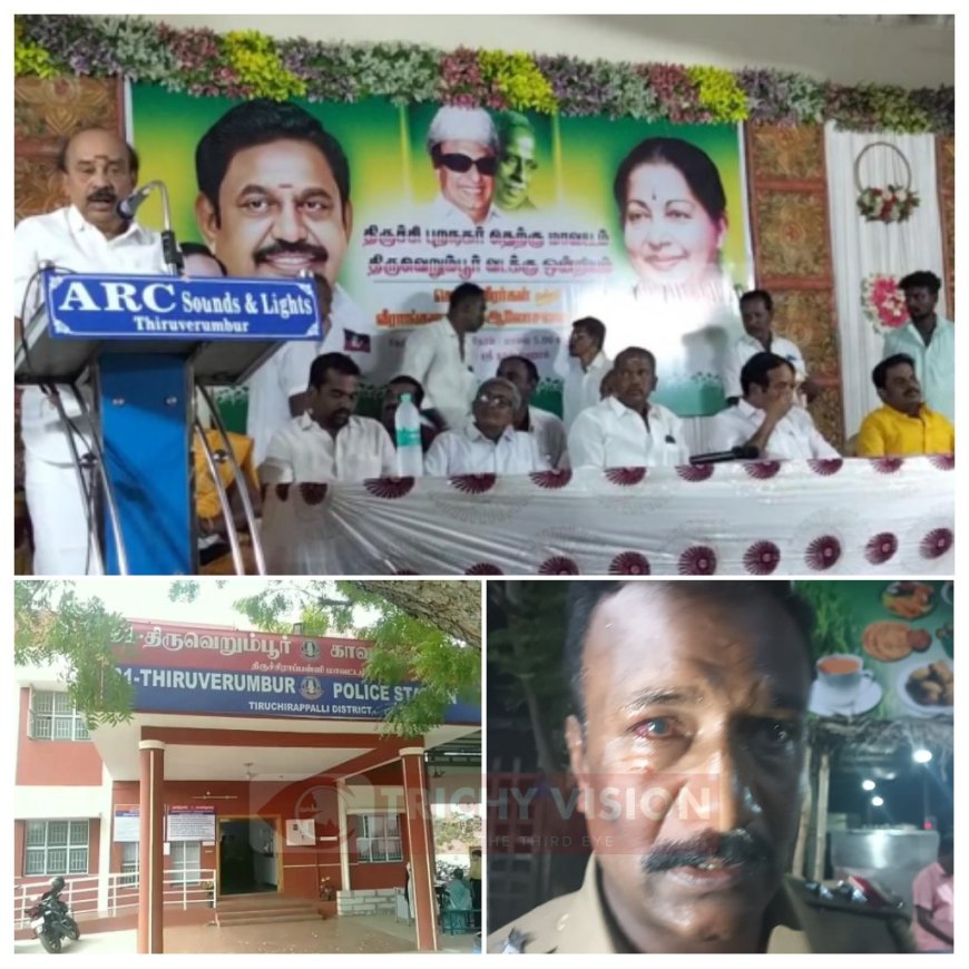 இந்த விழாவில் கலந்து கொள்வதற்காக திருச்சி புறநகர் தெற்கு மாவட்ட செயலாளர் குமார் அதிமுக அமைப்புச் செயலாளர் மனோகரை வரவேற்று திருவெறும்பூர் கூத்தைப்பார் பிரிவு சாலை அருகே கட் அவுட் பிளக்ஸ் பேனர்களும், கொடி கம்பங்களும் நட்டு இருந்ததோடு வெடி வைத்தனர்.