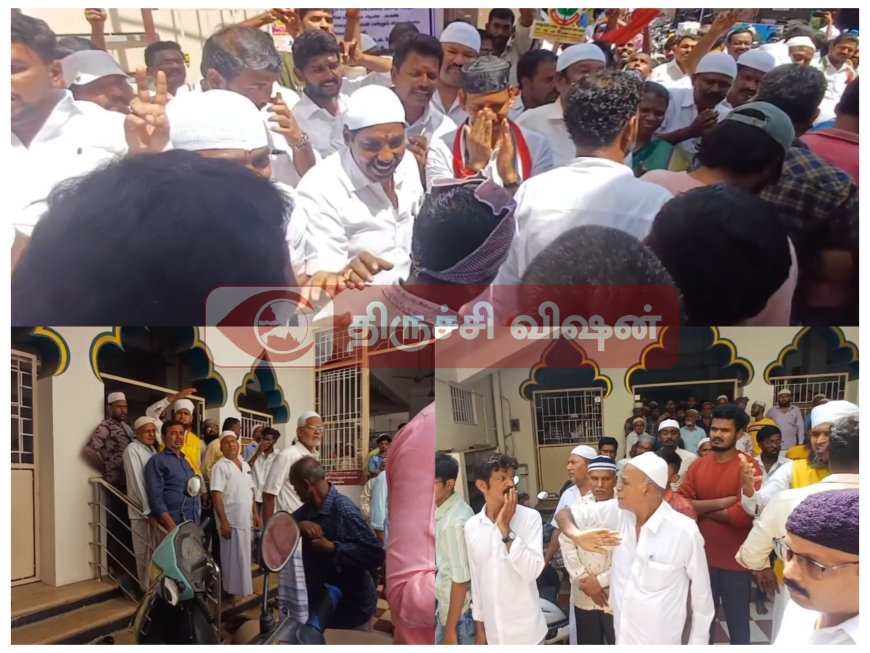 திருச்சி நாடாளுமன்ற தொகுதியில் அதிமுக சார்பில் போட்டியிடும் வேட்பாளர் கருப்பையா தீவிர பிரச்சாரத்தில் ஈடுபட்டு வருகிறார். இந்நிலையில் இன்று வெள்ளிக்கிழமை நானா மூனா பள்ளிவாசல் பகுதியில் தொழுகை முடித்து வெளியே வந்த இஸ்லாமியர்களிடம் வாக்கு சேகரித்தார். அப்போது அங்கு கூடியிருந்த அதிமுக தொண்டர்கள் மற்றும் கூட்டணி கட்சியில் உள்ள எஸ்டிபிஐ கட்சியினர் உள்ளிட்டவர்கள் வாக்கு சேகரித்தனர்,