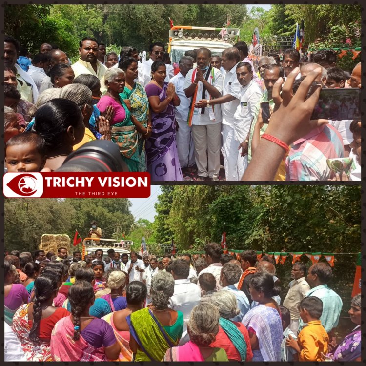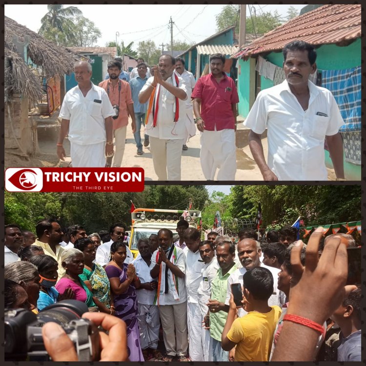 திருச்சி மாவட்டம் , லால்குடி அருகே மணக்கால் ஊராட்சியில் அதிமுக கூட்டணி கட்சி சார்பில் இரட்டை இலைச் சின்னத்தில் போட்டியிடும் வேட்பாளர் டி.ஆர். தர்மராஜ் தேர்தல் வாக்கு சேகரிக்கும் போது அப்பகுதி மக்களிடம் பேசிய போது