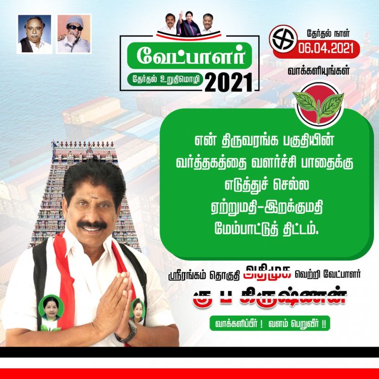 திருச்சி ஶ்ரீரங்கம் சட்டமன்ற தொகுதியில் போட்டியிடும் அதிமுக வேட்பாளர் கு.ப.கிருஷ்ணன் திருவரங்கம்கால் திருவானைக்கோவில், பாரதி நகரில் பிரச்சாரம் செய்தார். பின்னர் அப்பகுதி மக்கள் மத்தியில் பேசிய அவர்… அம்மாவின் அரசு அண்ணன் எடப்பாடியார் தலைமையில் எண்ணிலடங்கா நல்ல திட்டங்களை உங்கள் வீடுதேடி கொண்டு வந்து சேர்க்கிறது என்பதை தாங்கள் அறிவீர்கள். வாக்குறுதிகள் மட்டும் அளிக்கும் அரசு வேண்டுமா அல்லது நலத்திட்டங்களை செயல்பாட்டிற்கு கொண்டு வரும் அரசு உங்களுக்கு வேண்டுமா என்பதை சிந்தித்து பாருங்கள். மேலும் கந்துவட்டி, வழிப்பறி, அடுத்தவர் சொத்தை நில அபகரிப்பு செய்தல், கட்டப்பஞ்சாயத்து போன்ற செயலில் ஈடுபடும் அனைவரும் திமுக அணியில் ஒன்று சேர்ந்திருக்கிறார்கள். திமுக ஆட்சிக்கு வந்துவிட்டால் அமைதியான முறையில் தொழில் செய்ய முடியாது.