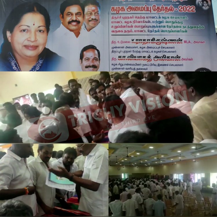 திருச்சி மாவட்டம் லால்குடி அருகே ஆங்கரை ஊராட்சியில் உள்ள சரோஜா திருமண மண்டபத்தில் அதிமுக கழக அமைப்பு தேர்தல் திருச்சி புறநகர் மாவட்ட தெற்கு மாவட்ட கழக செயலாளர், மாவட்ட கழக நிர்வாகிகள், பொதுக்குழு உறுப்பினர்களுக்கான தேர்தல் இன்று நடைபெற்றது.