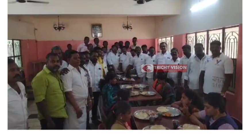 இந்த வகையில் திருச்சி மன்னார்புரம் விழி இழந்தோர் பள்ளி மாணவிகளுக்கு முன்னாள் நாடாளுமன்ற உறுப்பினரும், அதிமுக அமைப்பு செயலாளருமான ரத்தினவேல் தலைமையில் மதிய உணவு வழங்கப்பட்டது. இந்த நிகழ்ச்சியில் அதிமுக பகுதி செயலாளர்கள் பூபதி, சுரேஷ்குப்தா, ஏர்போர்ட் விஜி, அதிமுக திருச்சி மாநகர எம்.ஜி.ஆர் இளைஞர் அணி துணைச் செயலாளர் பொறியாளர் சுரேஷ்குமார் உள்ளிட்ட ஏராளமான நிர்வாகிகள் கலந்து கொண்டனர்.