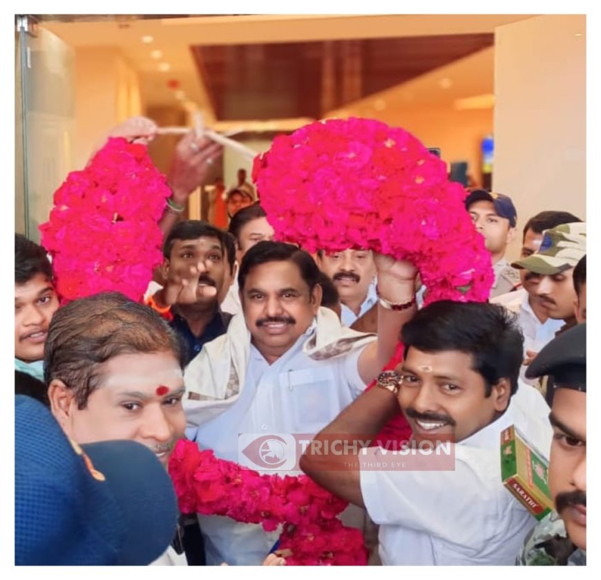 திருச்சி வந்தடைந்த அவருக்கு, திருச்சி மாநகர் மற்றும் புறநகர் மாவட்ட கழகம் சார்பில் அதிமுகவினர் செண்டை மேள தாளங்கள் முழங்க, உற்சாக வரவேற்பு அளித்தனர். இதில், அதிமுக புறநகர் தெற்கு மாவட்ட கழக செயலாளர், முன்னாள் எம்பி குமார், புறநகர் வடக்கு மாவட்ட கழக செயலாளர், முன்னாள் அமைச்சர் பரஞ்சோதி, திருச்சி மாநகர் மாவட்ட கழக செயலாளர், முன்னாள் துணை மேயர் சீனிவாசன் ஆகியோர் தலைமையில் அதிமுகவினர் எடப்பாடி பழனிச்சாமிக்கு ஆளுயர மலர் மாலை அணிவித்தும், பொன்னாடை வழங்கியும், பூங்கொத்து கொடுத்தும், புத்தகங்கள் வழங்கியும் சிறப்பான வரவேற்பு அளித்தனர்.