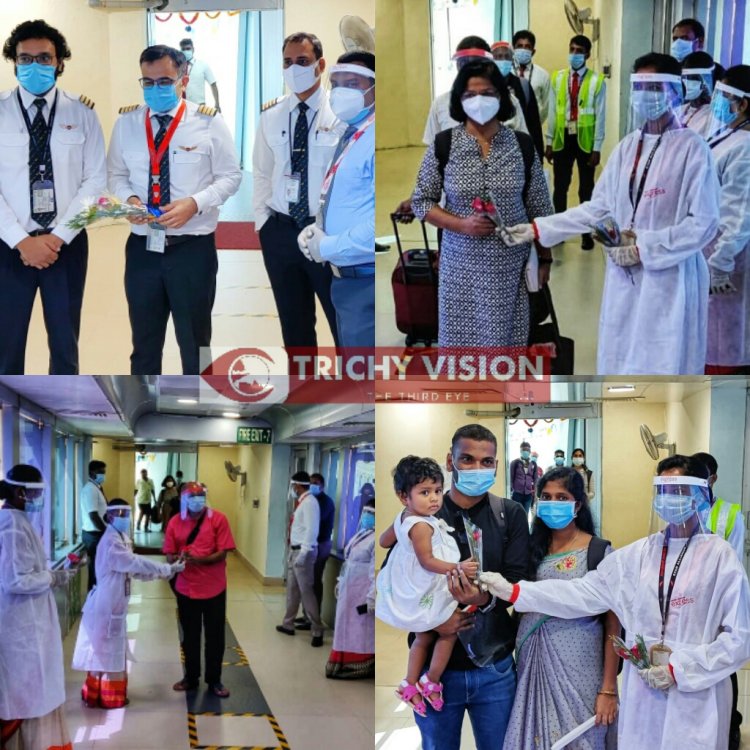 இந்த விமானத்தை வரவேற்கும் விதமாக திருச்சி விமான நிலையம் சார்பாக 2 தீயணைப்பு வாகனங்கள் மூலம் தண்ணீரை பீய்ச்சி அடித்து வரவேற்பு அளிக்கப்பட்டது. குறிப்பாக முதல்முறையாக வந்த பாரத் திட்டத்தின் கீழ்  இருந்து  146 பயணிகள் திருச்சி வருகை தந்தது குறிப்பிடத்தக்கது வருகை புரிந்த பயணிகளை விமான நிலைய ஊழியர்கள் பூங்கொத்து கொடுத்து வரவேற்றனர்.