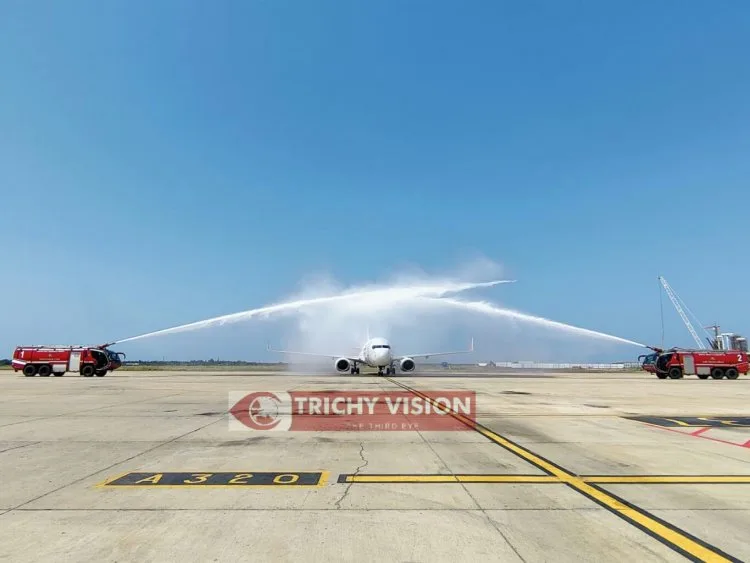 16 ஆண்டு காலத்தில் முதல் முறையாக மாலத்தீவில் இருந்து திருச்சிக்கு விமான சேவை – தண்ணீர் பீய்ச்சி அடித்து வரவேற்ற திருச்சி சர்வதேச விமான நிலையம்
