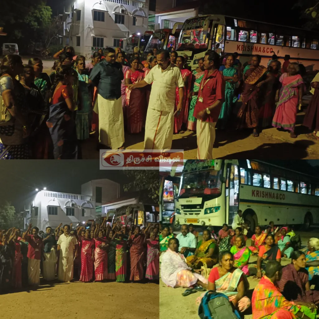 தமிழக அரசு ஏற்றுக் கொண்ட கோரிக்கைகளை அரசாணை வழங்கும் வரை 08.12.2025 காலை 10 மணி முதல் சென்னை பனகல் மாளிகை அருகில் காத்திருப்புப் போராட்டம் நடத்திட முறைப்படி அறிவித்து சென்னைக்கு புறப்பட்ட ஏஐடியுசி தலைமையிலான தமிழ்நாடு ஊரக வளர்ச்சித் துறை தொழிலாளர் சங்க திருச்சி மாவட்ட தலைவர் ராமலிங்கசாமி தலைமையிலான மூன்று பேருந்துகளில் புறப்பட்ட 150 தொழிலாளர்களை மணப்பாறை யூனியன் அலுவலகம் அருகில் காவல்துறை தடுத்து அங்கேயே நிறுத்தி வைத்துள்ளனர்.