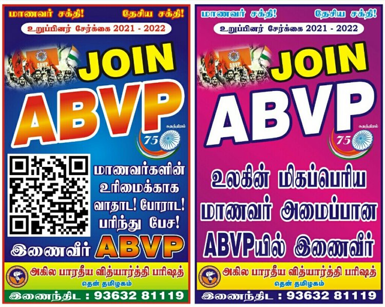 இந்த ஆண்டு கொரோனா கால விதிமுறைகளைப் பின்பற்றி நாடு முழுவதும் உறுப்பினர் சேர்க்கை நடைபெற்று வருகிறது. அதன் ஒரு பகுதியாக தென்தமிழகத்தில் உறுப்பினர் சேர்க்கையானது நேற்று 11.10.2021 முதல் தென் தமிழகத்தில் ஆரம்பிக்கப்பட்டது. இதில் பத்தாம் வகுப்புக்கு மேல் படிக்க கூடிய பள்ளி மாணவர்கள், கல்லூரி மாணவர்கள், பேராசிரியர்கள் உறுப்பினராக இணைய ஏபிவிபி அன்போடு அழைக்கிறது.