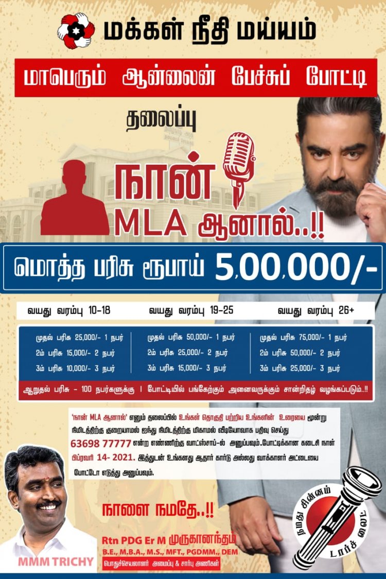 மக்கள் நீதி மய்யத்தின் திருச்சி தலைமையகம் மக்களின் வாழ்வில் அரசியலின் பங்கையும் அதன் முக்கியத்துவத்தையும் உணர்த்துவதற்காக “நான் MLA ஆனால்” எனும் தலைப்பில் பேச்சு போட்டியையும் “சீரமைப்போம் தமிழகத்தை” எனும் தலைப்பில் கட்டுரை போட்டியையும் வெளியிடுகின்றது.