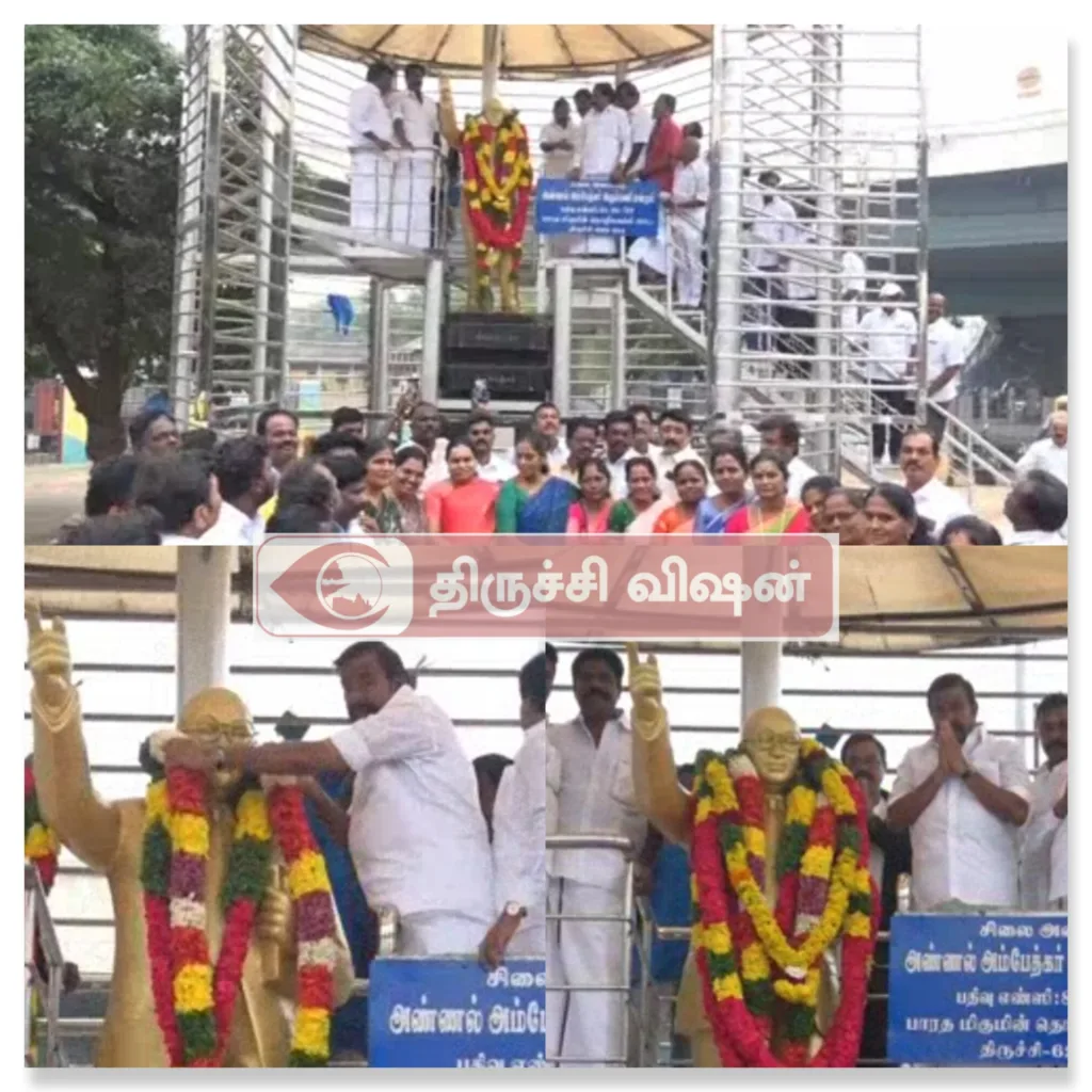 சட்டமேதை அம்பேத்கரின் 69 ஆவது நினைவு தினத்தையொட்டி திருச்சி மத்திய பேருந்துநிலையம் அருகில் உள்ள அரிஸ்டோ ரவுண்டானத்தில் அமைந்துள்ள அம்பேத்கர் சிலைக்கு திமுக சார்பில் அமைச்சர் கே.என் நேரு தலைமையில்,