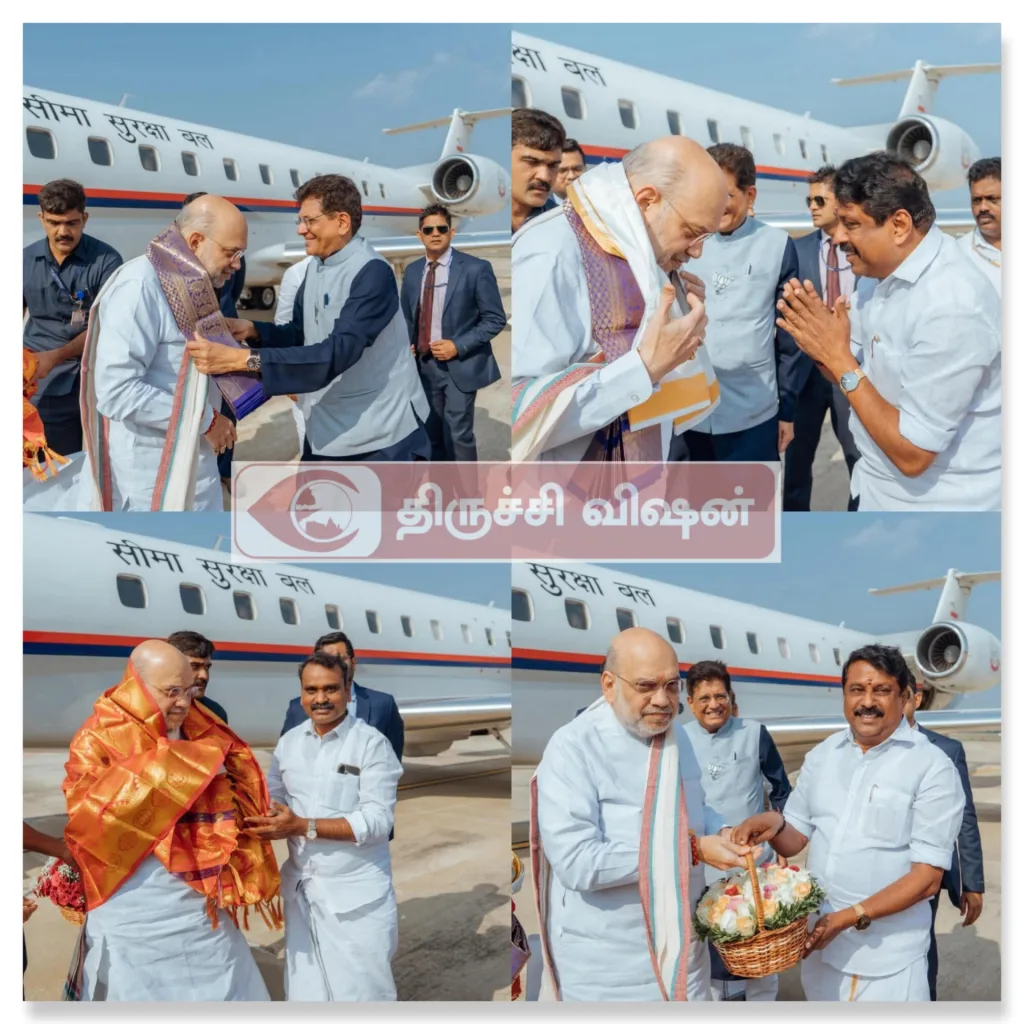 முன்னதாக திருச்சி வந்த அமித்ஷாவை பியூஸ் கோயல் , மத்திய இணை அமைச்சர்கம் முரளிதர் மோஹோல், எல்.முருகன் , பாஜக மாநில தலைவர் நயினார் நாகேந்திரன், சுதாகர் ரெட்டி, ஏ பி முருகானந்தம் அதிமுக முன்னாள் அமைச்சர்கள் தங்கமணி சி விஜயபாஸ்கர் பரஞ்சோதி காமராஜ் ஆகியோர் வரவேற்றனர்.