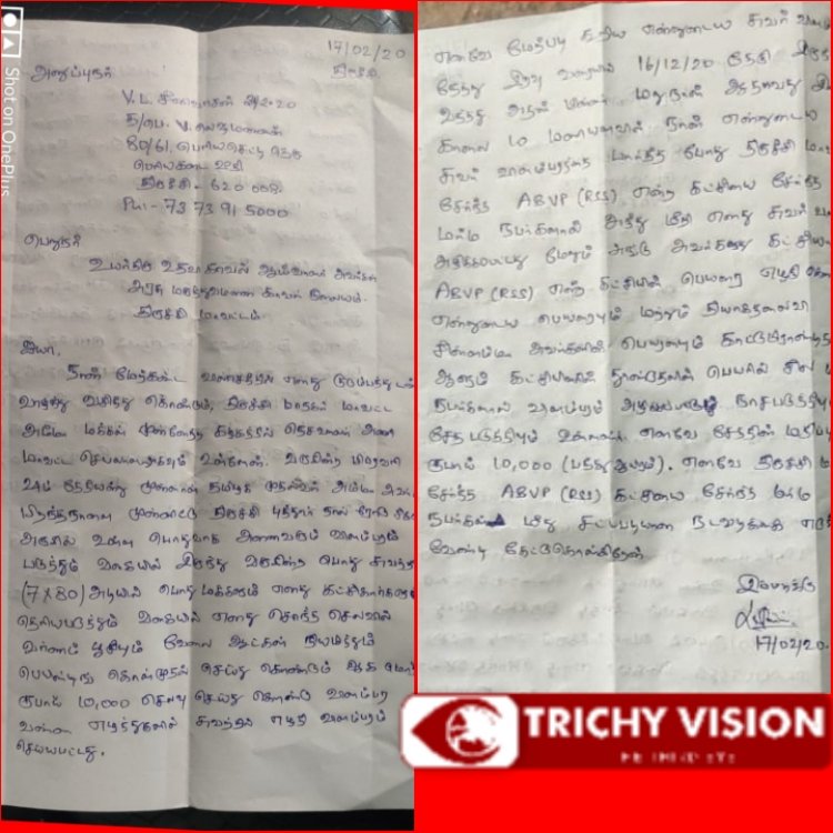 வருகிற பிப்ரவரி 24-ம் தேதி மறைந்த தமிழக முதல்வர் ஜெ ஜெயலலிதாவின் பிறந்த நாளை முன்னிட்டு அமமுக சார்பில் (7×80) அடியில் திருச்சி புத்தூர் நால்ரோடு பகுதியில் பொதுமக்கள் மற்றும் கட்சியினர் பார்க்கும் வண்ணம் எனது சொந்தப் பணத்தில் இருந்து ரூபாய் 10 ஆயிரம் செலவு செய்து சுவர் விளம்பரம் செய்திருந்தேன். இந்நிலையில் இன்று காலை நான் செலவு செய்து வரைந்த சுவர் விளம்பரத்தை ABVP (RSS)-யை சேர்ந்த மர்ம நபர்கள் அத்துமீறி எனது பெயரையும் மற்றும் தியாகத் தலைவி சின்னம்மா பெயர் வரைந்த சுவர் விளம்பரத்தை அளித்துவிட்டு அவர்களின் பெயரை எழுதியுள்ளனர். ஆளும்கட்சியின் தூண்டுதலின் பேரில் மர்ம நபர்கள் இந்த செயலில் ஈடுபட்டுள்ளனர். அவர்கள் மீது சட்டப்படி நடவடிக்கை எடுக்கக்கோரி அந்த புகார் மனு காவல் நிலையத்தில் அளிக்கப்பட்டுள்ளது.