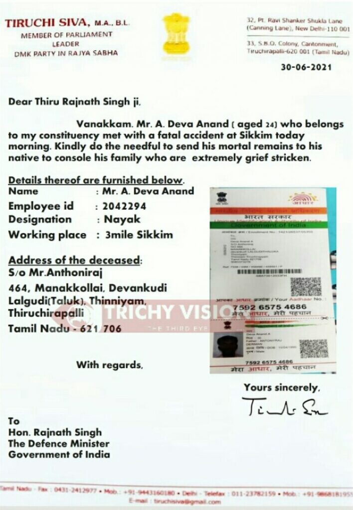 இந்திய ராணுவத்தில் சிக்கிமில் பணிபுரியும் திருச்சி மாவட்டம் லால்குடியை சேர்ந்த 24 வயதான தேவ் ஆனந்த் என்பவர் மரணமடைந்தார். இந்த செய்தி கேட்டு அவரது பெற்றோர் திருச்சி சிவா எம்.பியை அணுகினர்.