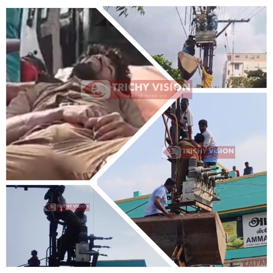 திருச்சி கருமண்டபம் பால்பண்ணை பகுதியில் டிரான்ஸ்பார்மில் பழுது ஏற்பட்டுள்ளது. இதனை சரி செய்வதற்காக மின் ஊழியர்கள் ஈடுபட்டு கொண்டிருந்தனர். அப்பொழுது டிரான்ஸ்பார்மில் ஏறி பழுதை சரி செய்து கொண்டிருந்த மணப்பாறையைச் சேர்ந்த முத்துக்குமார் (27) என்ற மின் ஊழியர் மீது மின்சாரம் பாய்ந்தது.