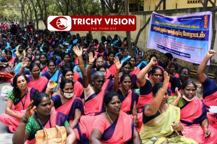 திருச்சி மாவட்ட ஆட்சியர் அலுவலகம் முன்பு 500க்கும் மேற்பட்ட அங்கன்வாடி ஊழியர்கள் காத்திருப்பு போராட்டம்
