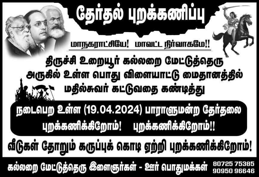 நடைபெற உள்ள பாராளுமன்றத் தேர்தலை புறக்கணிக்கிறோம் என கல்லறை மேட்டு தெரு இளைஞர்கள் ஊர் பொதுமக்கள் சார்பில் மாநகர் முழுவதும் சுவரொட்டிகள் ஒட்டப்பட்டுள்ளன.