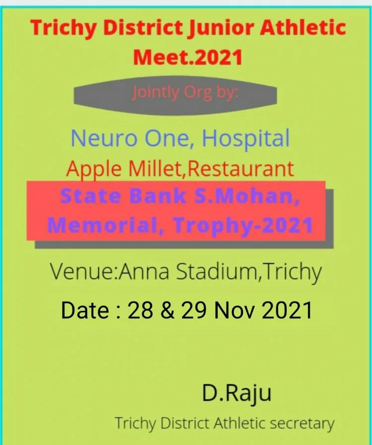 திருச்சி மாவட்ட தடகள சங்கம், நீயூரோ ஒன், ஆப்பிள் மில்லட் குழுமங்கள் இணைந்து நடத்தும் இளையோருக்கான (இருபாலர்) ஸ்டேட் பாங்க் எஸ்.மோகன் நினைவு சுழற் கோப்பை – 2021 என்ற பெயரில் மாவட்ட தடகள போட்டிகள் நடக்க இருக்கிறது. ஸ்டேட் பாங்க் எஸ்.மோகன், குழுமமும் இணைந்து வயது 12 ,14,16,18 & 20க்கும் கீழ் ஆகிய பிரிவுகளில் உள்ளவர்களுக்கு வருகிற வெள்ளிக்கிழமை (28.11.2021) மற்றும் சனிக்கிழமை (29.11.2021) ஆகிய தேதிகளில் இருபாலருக்குமான தடகள போட்டிகள் திருச்சி அண்ணா செயற்கை ஒடுதள விளையாட்டரங்கில் நடத்தப்பட உள்ளது.