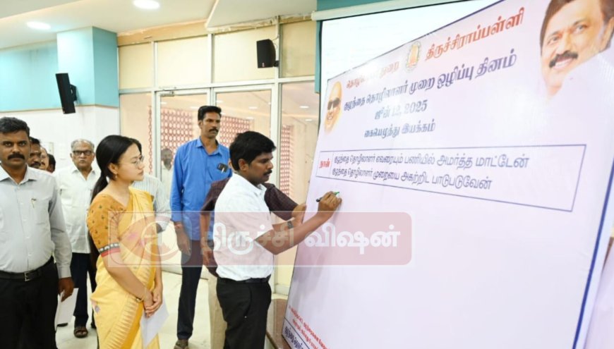 திருச்சி மாவட்ட ஆட்சியரகத்தில், குழந்தை தொழிலாளர் முறை எதிர்ப்பு தினத்தையொட்டி, மாவட்ட ஆட்சித்தலைவர் பிரதீப் குமார் தலைமையில் அனைத்துத்துறை அலுவலர்களும் இன்று (12.06.2025) குழந்தை தொழிலாளர் முறையினை அகற்றுவதற்கான உறுதிமொழி எடுத்துக் கொண்டனர்.