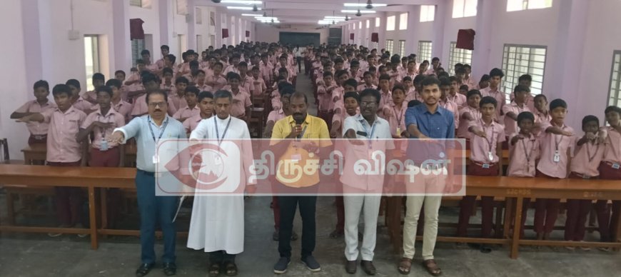 திருச்சி மாநகரம் சத்திரப்பேருந்து நிலையம் புனித வளனார் கல்லூரி மேல்நிலைப் பள்ளியில் போதைப்பொருள் தடுப்பு குறித்த விழிப்புணர்வு நிகழ்ச்சி பள்ளி தலைமை ஆசிரியர் ஜார்ஜ் தலைமையில் 27.02.25 நடைபெற்றது. சிறப்பு விருந்தினராக சென்னை உள், மதுவிலக்கு மற்றும்