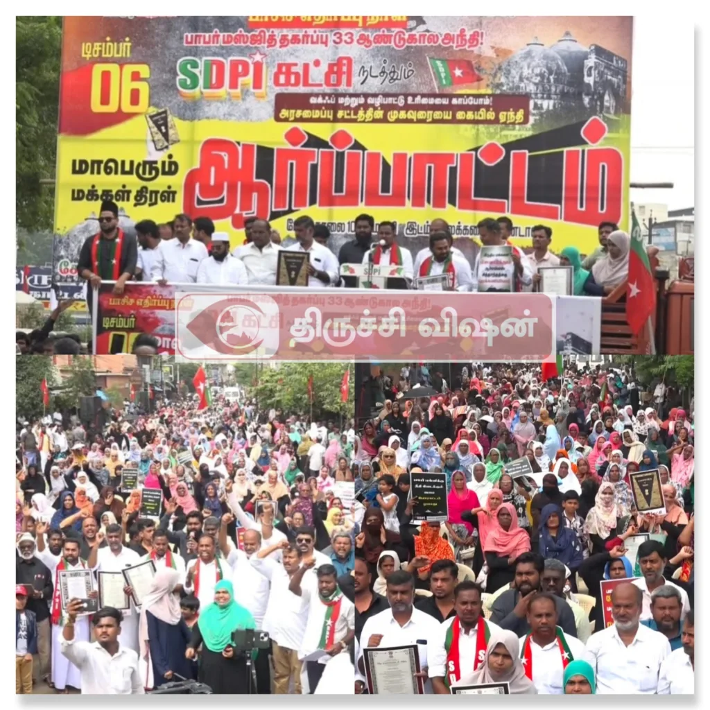 பாபர் பள்ளி இடித்த 33 ஆண்டுகள் அநீதி அரங்கேறிய தினத்தை முன்னிட்டு SDPI கட்சி திருச்சி மாவட்டம் சார்பாக பாலக்கரையில் அரசமைப்பு சட்ட முகவுரையை கையில் ஏந்தி மாபெரும் மக்கள் திரள் ஆர்பாட்டம் தெற்கு மாவட்ட தலைவர் கே.தமீம் அன்சாரி அவர்களின் தலைமையில் நடைபெற்றது.