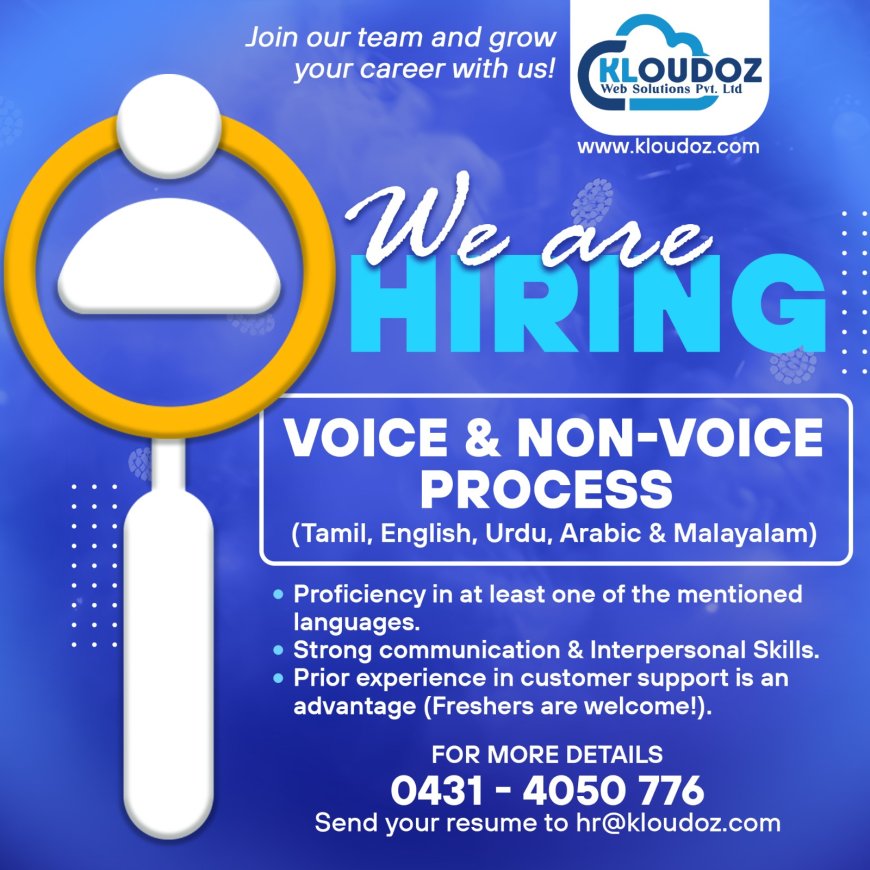 திருச்சியில் செயல்பட்டு வரும் KLOUDOZ web Solutions Pvt. Ltd நிறுவனத்தில் கீழ்க்கண்ட பணியிடத்திற்கு வேலை வாய்ப்பு அறிவிக்கப்பட்டுள்ளது. மேலும் விபரம் மற்றும் தொடர்புக்கு கீழே உள்ள படத்தை பார்க்கவும்.