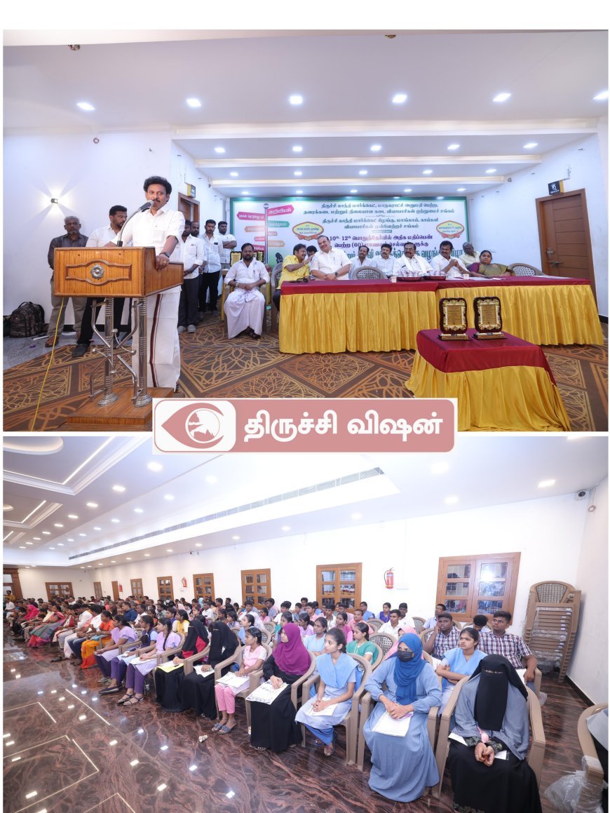 திருச்சி காந்தி மார்க்கெட் மாநகராட்சி அனுமதி பெற்ற தரைக்கடை மற்றும் நிலையான கடை வியாபாரிகள் ஒற்றுமை சங்கம் திருச்சி காந்தி மார்க்கெட் கிழங்கு மாங்காய் காய்கனி வியா பாரிகள் சங்கம் இணைந்து நடத்தும் 10 மற்றும் 12-ம் வகுப்பு பொதுத்தேர்வில் அதிக மதிப்பெண் பெற்ற மாணவச் செல்வங்களுக்கு பாராட்டு விழா மற்றும் கல்வி ஊக்கத்தொகை வழங்கும் விழா