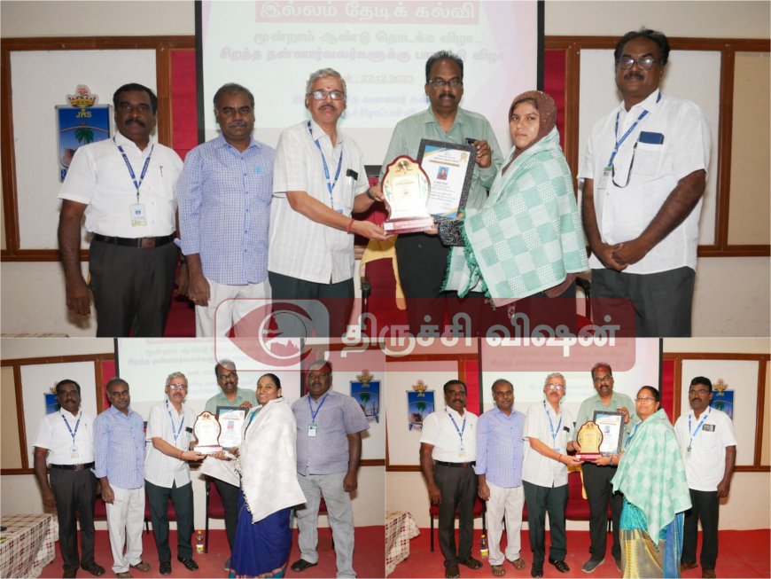 மாவட்ட ஒருங்கிணைப்பாளர் இளஞ்சேட் சென்னி வரவேற்றார். திருச்சி மாவட்ட கல்வி அதிகாரி (இடைநிலை) சங்கரநாரயணன் தலைமையேற்று, மாவட்ட உதவி அலுவலர் அன்பு சேகரன் முன்னிலை வகித்து, தன்னார்வலர்களுக்கு பொன்னாடை, விருது மற்றும் சான்றிதழ்களை வழங்கி வாழ்த்துரை வழங்கினார்.