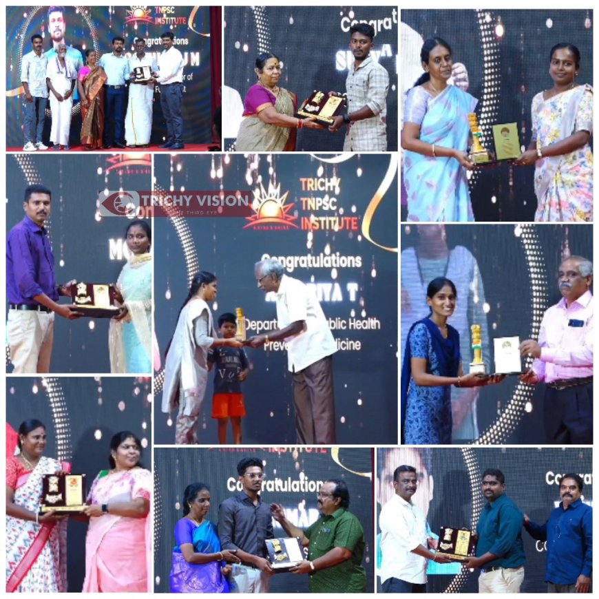 திருச்சி டிஎன்பிஎஸ்சி இன்ஸ்டியூட்டில் சார்பில் குரூப் 2 மற்றும் குரூப் 4 தேர்வுகளில் வெற்றி பெற்ற சாதனையாளர்களுக்கு பாராட்டு விழா திருச்சி தெப்பக்குளம் அருகே உள்ள பிஷப் ஹீபர் மேல்நிலைப்பள்ளி வளாகத்தில் உள்ள கூட்டரங்கில் நடைபெற்றது.