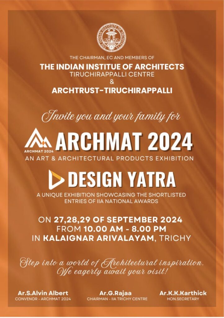 திருச்சி 27 – 29 செப்டம்பர் 2024*: இந்திய கட்டிடக் கலைஞர்கள் நிறுவனம் (IIA), திருச்சிராப்பள்ளி மையம் மற்றும் ArchTrust-Tiruchirappalli இணைந்து ARCHMAT 2024 என்ற பிரம்மாண்டமான கலை மற்றும் கட்டிடப் பொருட்களின் கண்காட்சியை நடத்த உள்ளனர்.