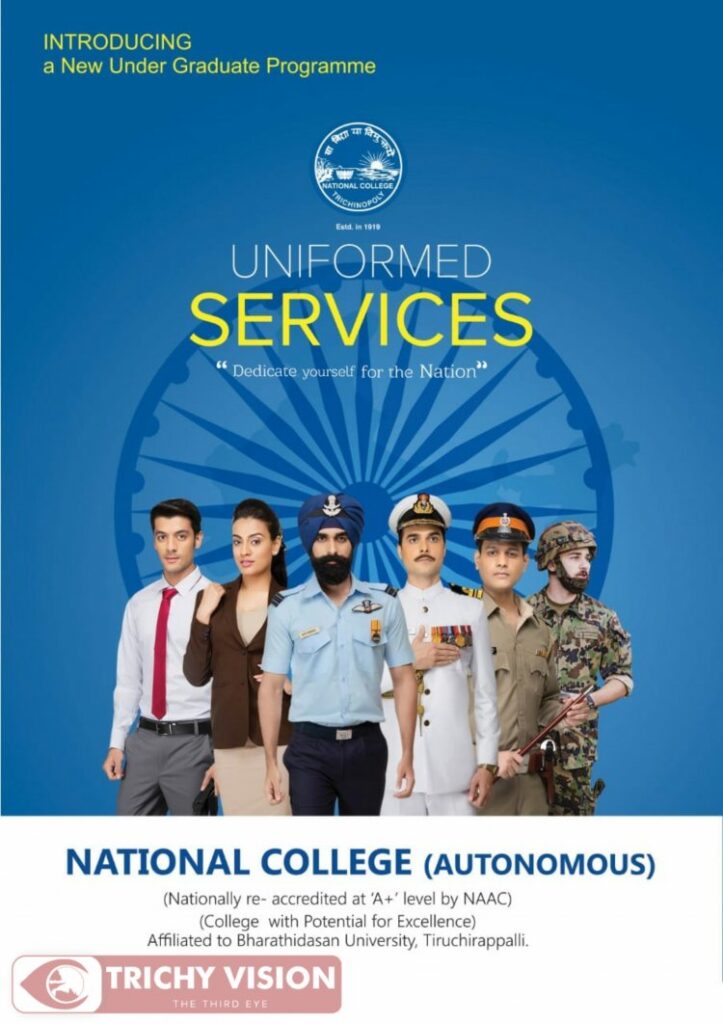 பள்ளிப்படிப்பை முடித்த ஒவ்வொரு மாணவர்களுக்கும் ஒவ்வொரு கனவு இருக்கும். அடுத்து என்ன படிக்கலாம்? எப்போது படிக்கலாம்? எப்படி படிக்கலாம்? என்ற சிந்தனைகள் தோன்றும். உங்கள் கனவுகள் அனைத்தையும் மெய்ப்பிக்கும் வகையில் இந்தியாவிலேயே முதல் முறையாக நம்முடைய திருச்சி மாநகரில் யூனிபார்ம் சர்வீஸ் (BA, Uniform Service) பட்டப் படிப்பை திருச்சி தேசியக் கல்லூரியில் வரும் கல்வியாண்டில் அறிமுகப்படுத்த உள்ளனர்.