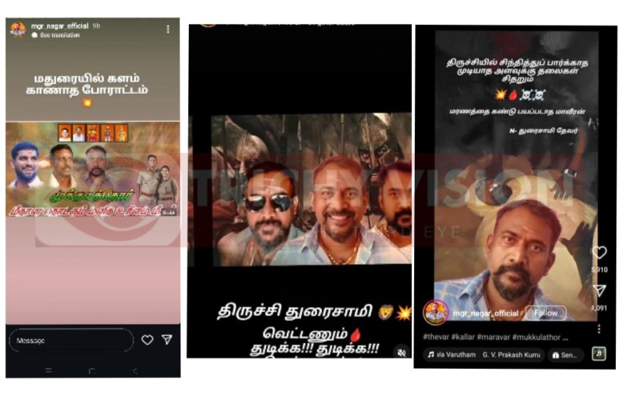 இந்நிலையில், இறந்துபோன எம்.ஜி.ஆர் நகர் துரைசாமியின் ஆதரவாளர்கள் சில தினங்களுக்கு முன்பாக, இன்ஸ்டாகிராம் (Instagram) தளத்தில், “mgr-nagar- official” முகவரியில் இருந்து திருச்சிராப்பள்ளி மாவட்ட காவல் கண்காணிப்பாளர் டாக்டர். வருண்குமார், புகைப்படத்தை பகிர்ந்து, அத்துடன் “திருச்சியில் சிந்தித்து பார்க்கமுடியாத அளவிற்கு தலைகள் சிதறும்” என்ற பதிவை பகிர்ந்து பொதுமக்கள் மத்தியில் அமைதிக்கு பங்கம் விளைவிக்கும் வகையிலும், கலவரங்களை தூண்டும் விதத்திலும் இன்ஸ்டா ஸ்டோரி பதிவேற்றம் செய்யப்பட்டிருந்தது.
