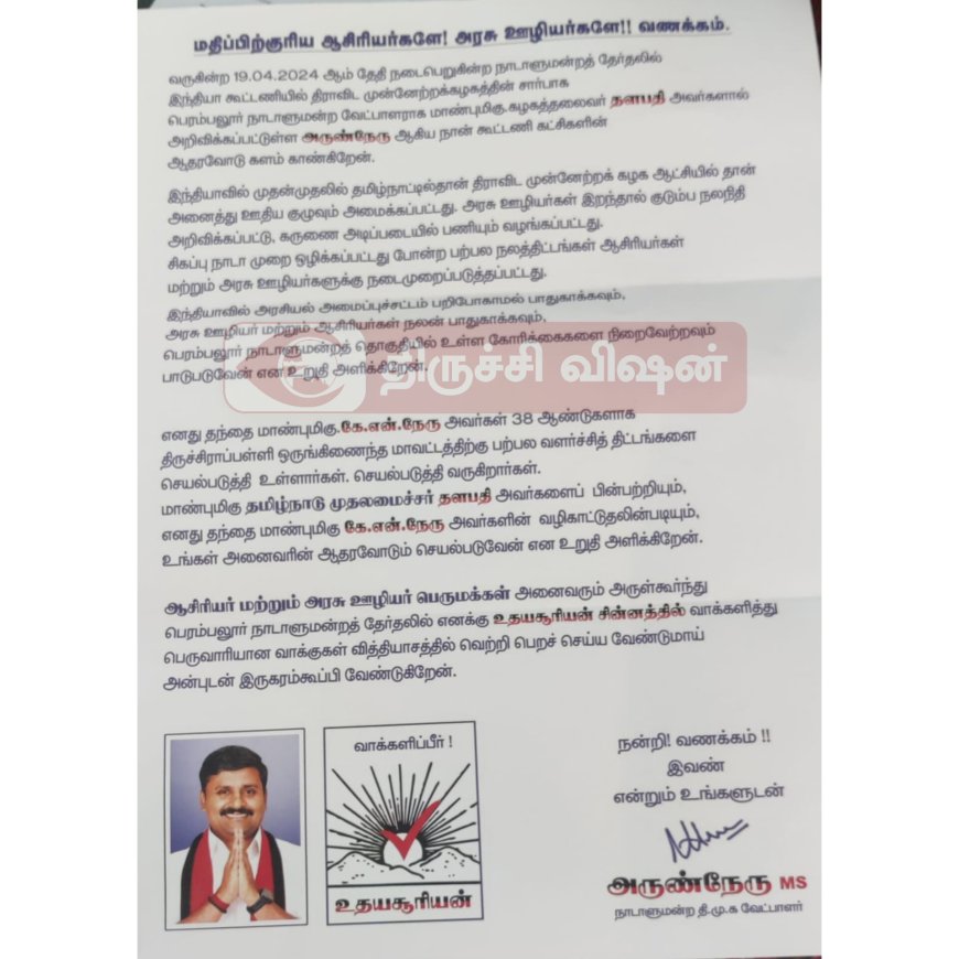 வருகின்ற 19.04.2024 ஆம் தேதி நடைபெறுகின்ற நாடாளுமன்றத் தேர்தலில் இந்தியா கூட்டணியில் திராவிட முன்னேற்றக்கழகத்தின் சார்பாக பெரம்பலூர் நாடாளுமன்ற வேட்பாளராக மாண்புமிகு.கழகத்தலைவர் தளபதி அவர்களால் அறிவிக்கப்பட்டுள்ள அருண்நேரு ஆகிய நான் கூட்டணி கட்சிகளின் ஆதரவோடு களம் காண்கிறேன்.