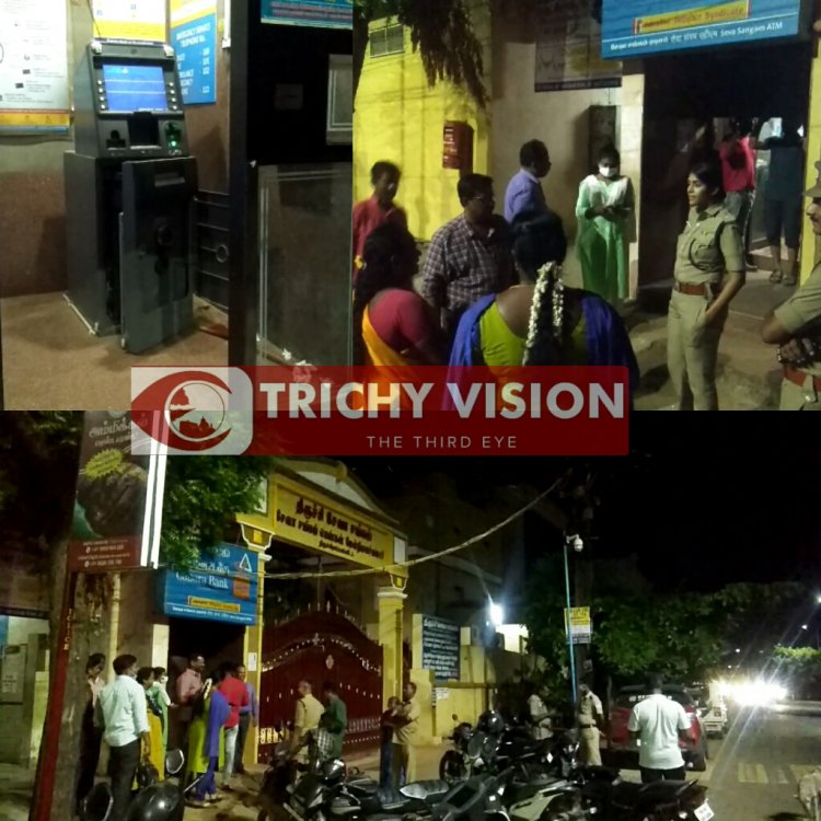 திருச்சி மத்திய பேருந்து நிலையம் அருகே உள்ள சேவா சங்கம் பெண்கள் மேல்நிலைப்பள்ளி நுழைவு வாயில் அருகில் உள்ள கனரா வங்கி ஏடிஎம் மையம் உள்ளது. இரவு 10.30 மணிக்கு 2 பேர் பணம் எடுக்க உள்ளே நுழைந்துள்ளனர். அவர்கள் பணத்தை எடுத்து செல்லும் பொழுது திடீரென இயந்திரத்தில் பணம் வைக்கப்பட்டுள்ள கதவு தானாக திறந்தால், எச்சரிக்கை மணி அடித்தது. இருவரும் பயந்து எச்சரிக்கை மணி ஒலித்ததால் ஓட்டம் பிடித்தனர்.