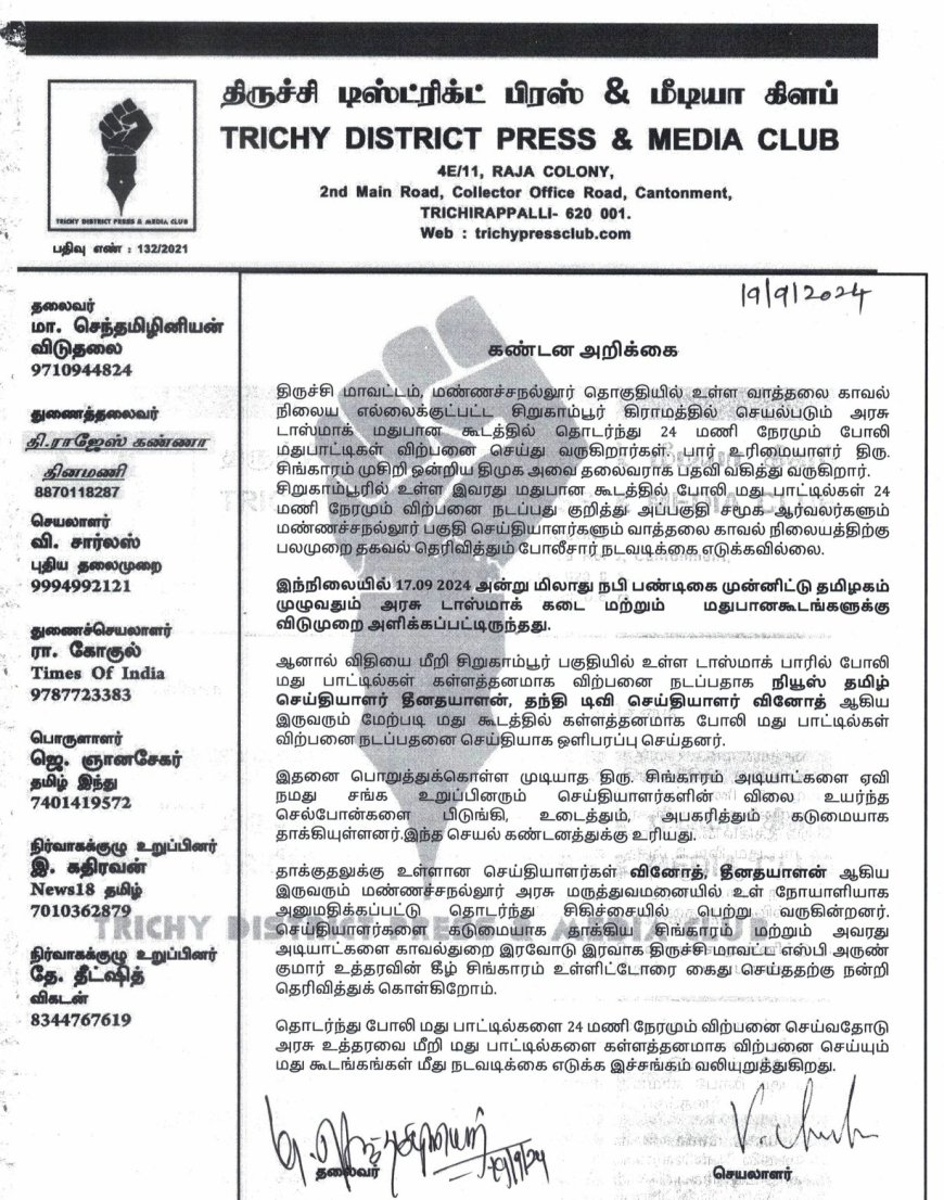 இந்த நிலையில் தாலுகா செய்தியாளர்கள் மீது தாக்குதல் நடத்தியவர்களை திருச்சி டிஸ்ட்ரிக்ட் பிரஸ் & மீடியா கிளப் வன்மையாக கண்டிக்கிறது. மேலும் தாக்குதல் நடத்தியவர்களை கைது செய்ததற்கு திருச்சி மாவட்ட எஸ்பி வருண் குமார் நன்றி தெரிவித்துக் கொள்கிறது. தொடர்ந்து போலி மது பாட்டில்களை 24 மணி நேரமும் விற்பனை செய்வதோடு அரசு உத்தரவை மீறி மது பாட்டில்களை கள்ளத்தனமாக விற்பனை செய்யும் மது கூடங்கங்கள் மீது நடவடிக்கை எடுக்க இச்சங்கம் வலியுறுத்துகிறது