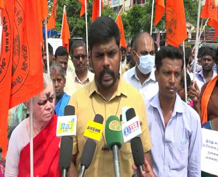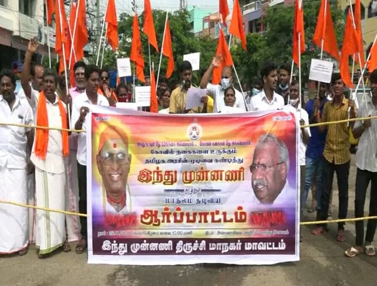 இதன் ஒருபகுதியாக திருச்சி அண்ணாசிலை அருகில் இந்து முன்னனி மாவட்ட தலைவர் மனோஜ்குமார் தலைமையில் கண்டன ஆர்பாட்டம் நடைபெற்றது. இதில் கலந்துக் கொண்டவர்கள் கையில் பதாகைகளை ஏந்தியபடி திமுக அரசின் இத்தகைய செயலைக் கண்டித்தும், அறநிலையத்துறையை விட்டு வெளியேற வலியுறுத்தி கண்டண கோஷமிட்டனர்.