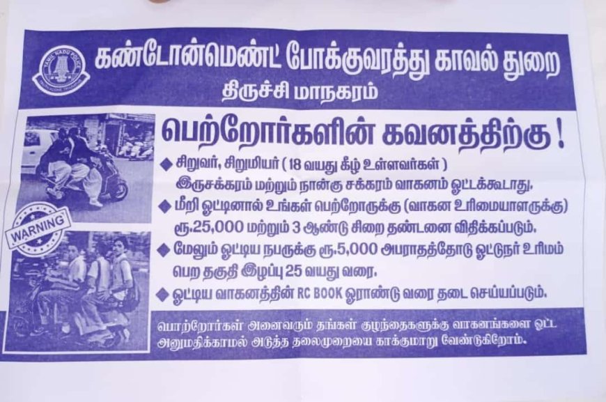திருச்சி மாநகரம் கண்டோன்மெண்ட் போக்குவரத்து காவல்துறை சார்பில் பெற்றோர்களின் கவனத்திற்கு! – அறிவிக்கப்பட்டுள்ளது.