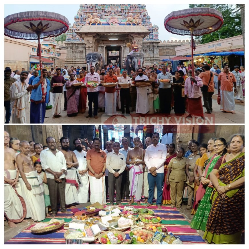 பின்னர் கோவில் தலைமை அர்ச்சகர் சுந்தர் பட்டர் பட்டுவஸ்திரங்களை யானை மீது அமர்ந்து எடுத்து வர, ஸ்ரீரங்கம் கோவில் இணை ஆணையர் மாரியப்பன் மற்றும் கோவில் பணியாளர்கள் மங்களப் பொருட்களை கையில் ஏந்தியும், தலையில் சுமந்தும் மேளதாளம் முழங்க ஊர்வலமாக கோவிலுக்கு இன்று (செவ்வாய்க்கிழமை) ஸ்ரீரங்கம் கோவில் நிர்வாகத்தினரால் இந்த மங்களப்பொருட்கள் ஸ்ரீவில்லிபுத்தூர் ஆண்டாள் கோவிலுக்கு எடுத்து செல்லப்பட்டு அக்கோவில் நிர்வாகத்தினரிடம் சமர்ப்பிக்கப்படும்.