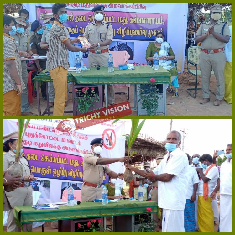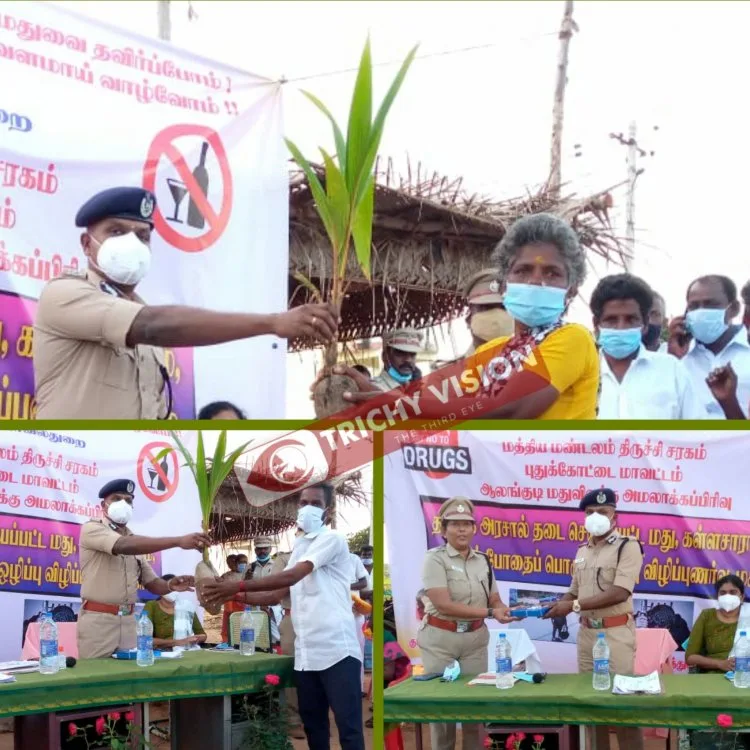 கிருஷ்ணம்பட்டி கிராம பொது மக்களுக்கு விழிப்புணர்வை ஏற்படுத்தியும், கிராமத்தில் கள்ளச்சாராயம் தொழிலில் ஈடுபட்டு  தற்பொழுது மனம் திருந்தி வாழ்ந்து வரும் பயனாளிகள் சந்திரா ராஜப்பன், தனபால், பவுன்ராஜ் ஆகியோருக்கு தென்னை மரக் கன்றுகளை மத்திய மண்டல காவல்துறை தலைவர் வழங்கினார்.மேலும் கறம்பக்குடி ரீனா மெர்சி பள்ளியில் பயிலும் மாணவர்களுக்கு கள்ளச்சாராயத்தினால் ஏற்படும் தீமைகள் பற்றி ஓவியப் போட்டி,  கட்டுரைப் போட்டி, பேச்சுப் போட்டி நடத்தியும் வெற்றிபெற்ற மாணவிகளுக்கு  காவல்துறை தலைவர்  பரிசுகள் வழங்கி கெளரவித்தார்.