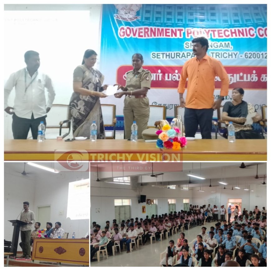 திருச்சி மாவட்ட காவல் கண்காணிப்பாளர் வீ.வருண் குமார், உத்தரவின்படியும், கூடுதல் காவல் கண்காணிப்பாளர் கோடிலிங்கம் (சைபர் கிரைம் பிரிவு) அறிவுறுத்தலின்படியும் திருச்சி மாவட்ட சைபர் கிரைம் காவல் காவல் நிலையம் சார்பாக சேதுராப்பட்டி அரசு பாலிடெக்னிக் கல்லூரி மாணவ, மாணவியர்களுக்கு சைபர் குற்றங்கள் பற்றிய விழிப்புணர்வு ஏற்படுத்தப்பட்டது.