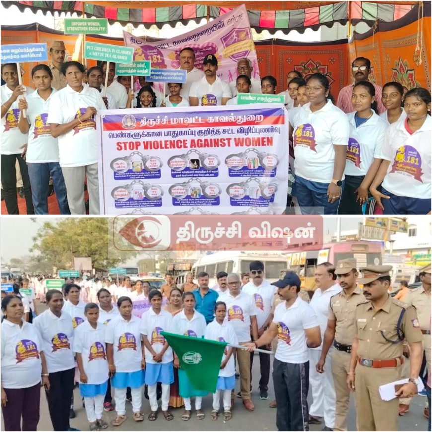 திருச்சி மாவட்ட எஸ்பி தலைமையில் சர்வதேச மகளிர் தினத்தை முன்னிட்டு குழந்தைகள் மற்றும் பெண்களுக்கான விழிப்புணர்வு பேரணி – பள்ளி, கல்லூரி குழந்தைகள் உட்பட 500 க்கும் மேற்பட்ட பெண்கள் மற்றும் பெண் காவலர்கள் கலந்து கொண்டனர்