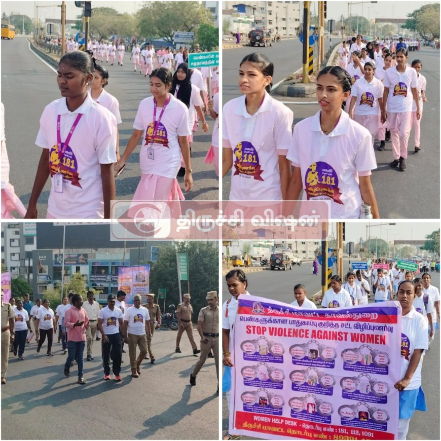 திருச்சி மாவட்ட எஸ்பி தலைமையில் சர்வதேச மகளிர் தினத்தை முன்னிட்டு குழந்தைகள் மற்றும் பெண்களுக்கான விழிப்புணர்வு பேரணி – பள்ளி, கல்லூரி குழந்தைகள் உட்பட 500 க்கும் மேற்பட்ட பெண்கள் மற்றும் பெண் காவலர்கள் கலந்து கொண்டனர்