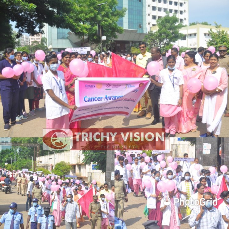 திருச்சி அரசு தலைமை மருத்துவமனை மற்றும் சக்தி ரோட்டரி கிளப் இணைந்து மார்பக புற்றுநோய் குறித்த விழிப்புணர்வு பேரணி இன்று நடைபெற்றது. இந்த பேரணியை அரசு மருத்துவமனை மருத்துவ கண்காணிப்பாளர் அருண் கொடியசைத்து துவக்கி வைத்தார். பெண்களுக்கு மார்பக புற்றுநோய் குறித்த விழிப்புணர்வை ஏற்படுத்தும் விதமாக