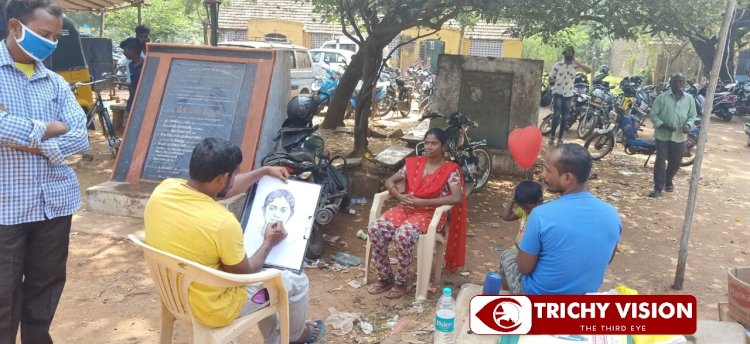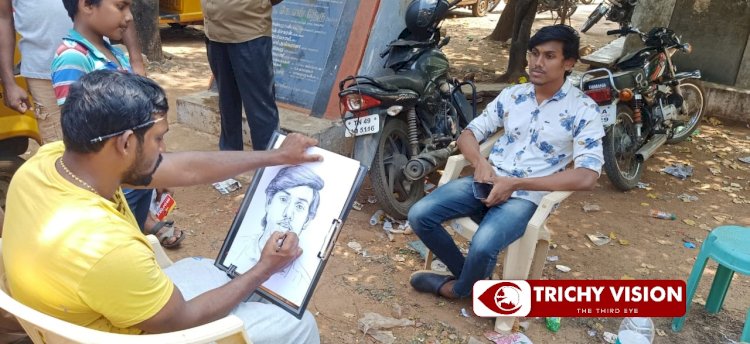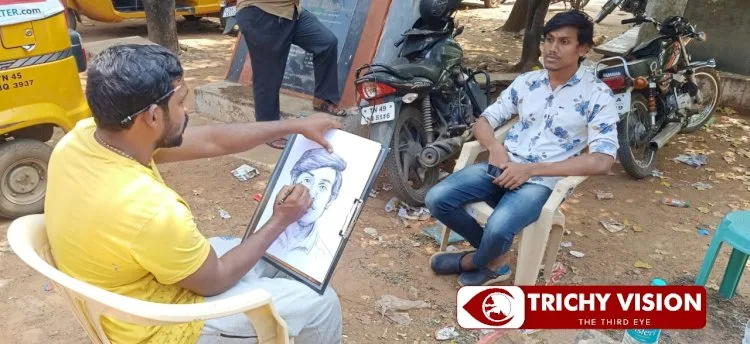 இந்நிலையில் கடந்த ஞாயிற்றுக்கிழமை பொன்மலை சந்தையில் அதிகமான கூட்டத்திற்கும், வித்தியாசமான பொருள்களும் மத்தியில் ஒரு நபரை சுற்றி பல்வேறு மக்கள் குவிந்து வேடிக்கை பார்த்தனர். அங்கு இருந்தவர் ஒருவரை எதிரே அமர வைத்து தத்துரூபமாக வரைந்தது அனைவரையும் மெய்சிலிர்க்க வைத்தது. அவர் திருச்சி காட்டூர் பகுதியை சேர்ந்த ஓவியர் சித்தன் சிவா என்பது தெரியவந்ததது.இவர்தான் ஏற்கனவே திருச்சி மாநகராட்சி பற்றி கொரோனா காலகட்டத்தில் தத்ரூபமாக அப்படியே காட்சிகளை பதிவிட்டவர்.