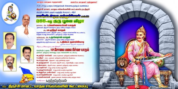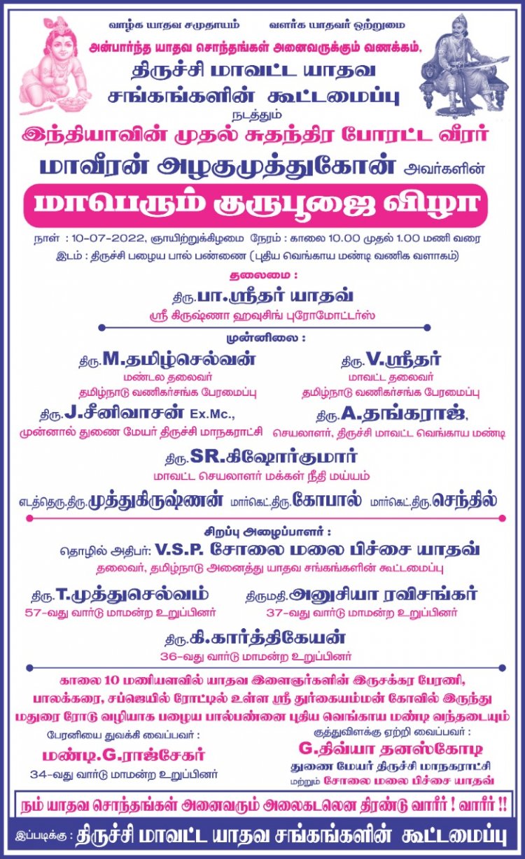 திருச்சி மாவட்ட யாதவ சங்கங்களின் கூட்டமைப்பு நடத்தும் இந்தியாவின் முதல் சுதந்திர போராட்ட வீரர் மாவீரன் அழகுமுத்துக்கோன் அவர்களின் 265வது மாபெரும் குருபூஜை விழா நாளை காலை 10 மணியளவில் திருச்சி பழைய பால்பண்ணையில் நடைபெற உள்ளது.