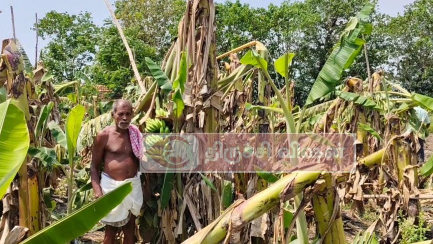 துறையூர் அருகே சூறைக்காற்றில் வாழை மரங்கள் சேதம் விவசாயிகள் கவலை.திருச்சி மாவட்டம் உப்பிலியபுரம் ஒன்றியத்துக்கு உட்பட்ட ஏரகுடி ஊராட்சியில் சுமார் 15 ஏக்கர் பரப்பளவில் விவசாயிகள் வாழை மரங்களை பயிரிட்டுள்ளனர் தற்போது வாழைத்தார்கள்