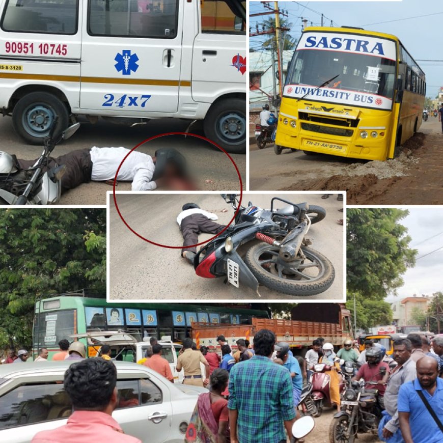 வயலூரிலிருந்து சாஸ்திரா பல்கலைக்கழகம் நோக்கி செல்லும் கல்லூரி வாகனம் கல்லூரி மாணவ, மாணவிகளை ஏற்றுக்கொண்டு சென்று கொண்டிருந்தபோது அக்கல்லூரி பேருந்து பள்ளத்தில் சிக்கியது. உடனடியாக கல்லூரி மாணவர்கள் பேருந்தில் இருந்து இறக்கிவிடப்பட்டு மாற்று பேருந்தில் அனுப்பி வைக்கப்பட்டனர்.