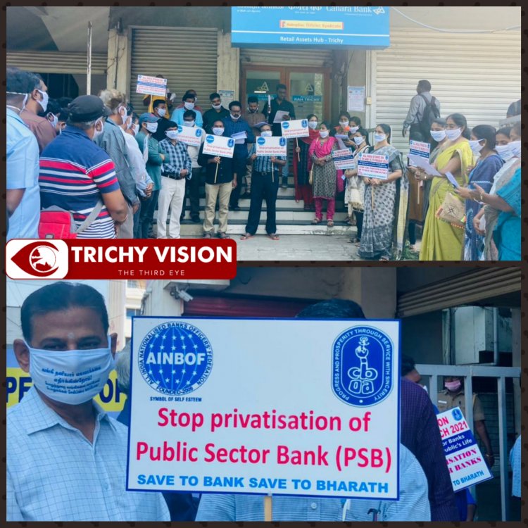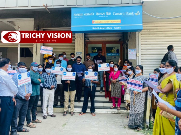 அதன் ஒரு பகுதியாக திருச்சி மத்திய பேருந்து நிலையம் அருகே உள்ள கனரா வங்கி ஊழியர்கள் இன்று காலை போராட்டத்தில் ஈடுபட்டனர். 50க்கும் மேற்பட்டோர் கலந்து கொண்ட இந்த போராட்டத்தில், வங்கிகள் தனியார் மயமாக்கும் தை எதிர்த்து கோஷங்கள் எழுப்பப்பட்டன.