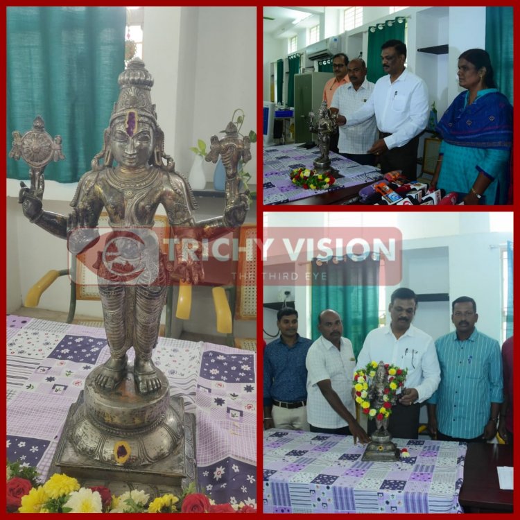 அதன்படி கடந்த 7ஆம் தேதி மாலை 4 மணி அளவில் சிலையை வாங்குவதற்காக மாறுவேடத்தில் சென்ற தனிப்படையினர் பழனிச்சாமியிடம் சிலையை கேட்ட போது அவர் மறைத்து வைத்திருந்த 22.800 கிலோ எடையுள்ள, 58 செ.மீ உயரமும், 31 செ.மீ அகலமும் உள்ள சிலையை எடுத்து காண்பித்துள்ளார். அந்த சிலையை பறிமுதல் செய்த அதிகாரிகள் அது யாருக்கு சொந்தமானது என்பது குறித்து விசாரணை நடத்தியுள்ளனர். இது குறித்து இன்று செய்தியாளர்களை சந்தித்து பேசிய திருச்சி சரக சிலை கடத்தல் தடுப்பு பிரிவு ஏடிஎஸ்பி பாலமுருகன்….. பழனிச்சாமி என்பவர் இந்த சிலையை விற்க முயன்றதும் தெரிய வந்தது. அதேபோல் கர்நாடக மாநிலம் மாண்டியாவில் உள்ள ஒரு கோவிலில் இருந்து அர்ச்சகர் மூலம் இந்த சிலை விற்பனை செய்வதற்கு சென்றதாக முதல் கட்ட விசாரணையில் தெரியவந்துள்ளது.